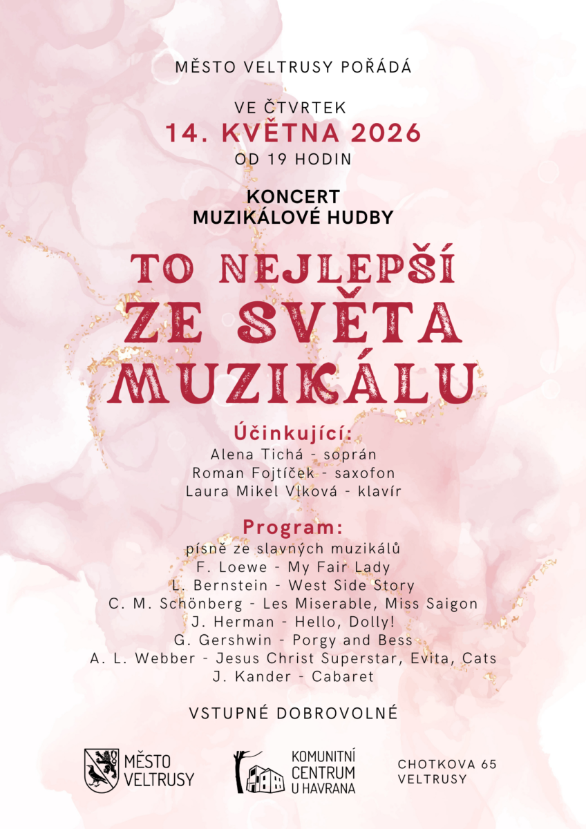 Město Veltrusy a komunitní centrum U Havrana pořádá koncert muzikálové hudby nazvaný TO NEJLEPŠÍ ZE SVĚTA MUZIKÁLU.