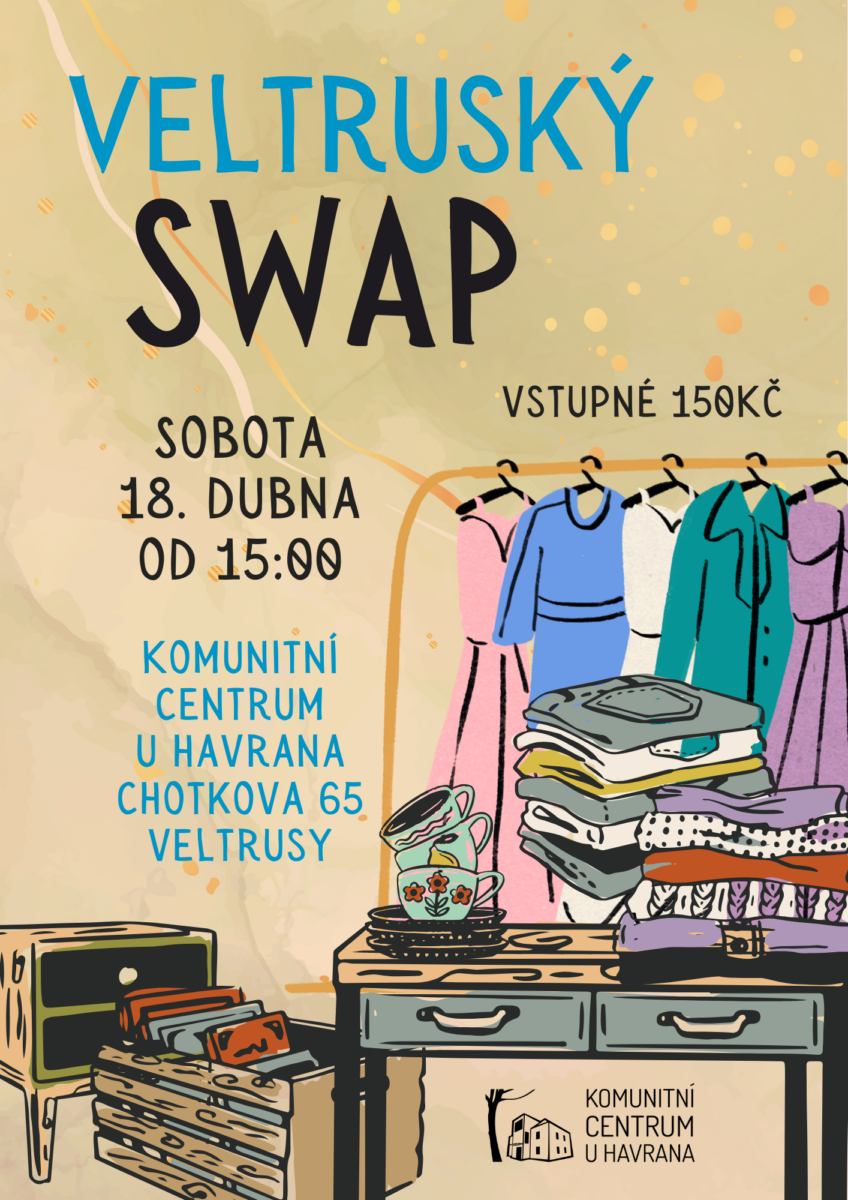 V sobotu 18. dubna 2026 od 15:00 se v Komunitním centru uskuteční oblíbený Veltruský SWAP. Za jednotné vstupné 150 Kč si můžete bez dalších poplatků vybrat oblečení a další věci v množství, které unesete.